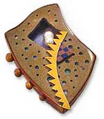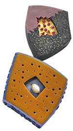 Ai-Ping is an extremely talented artsit. She gave ademo at Ravensdale 2002 at Evergreen on how she makes the hollow constructed forms. The method she uses includes multiple bakings and is very similar to how a metalsmith would construct hollow boxes. What makes her pieces so special is not the construction as much as the sense of playfulness with the tension between the outer surfaces and the ability to see things inside coupled with her sensitive use of color. I am lucky enough to have one of her fabulous hollow beads.