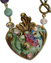 Rome’s Marina Lombardi (Ali di Libellula) makes lyrical jewelry by pairing delicate polymer clay focal pieces with pearls, filigree, stones and crystals. She coaxes microspheres into just the right spots for hints of color and texture.