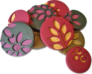 Rebecca Geoffrey’s polymer clay pendants look just right for a Friday – fall colors, tidy layered construction, judicious texturing.