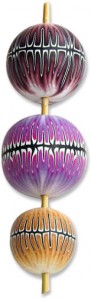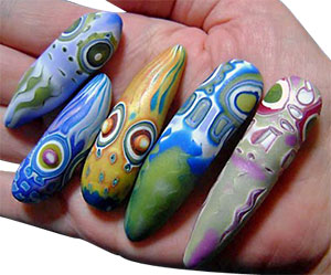 These polymer pendants from France’s Cathy (dumauvobleu) are intensely caned, collaged and textured. Balancing colors and patterns takes skill and patience. Cathy must have her dot technique down to a rapid fire rat-ta-tat-tat because her Flickr pages are full of patterns riddled with texturing.