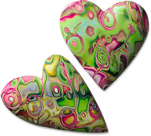 Absolutely beautiful, both the designs and the shapes — who knew puffy hearts could have so many lovely variations!? Ron is perhaps the most giving person in polymer clay. Makes me feel a bit guilty — might have to find something to DO about that!