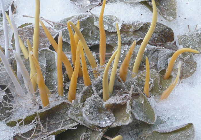 This Vancouver artist takes polymer rocks back to the seashore where they look completely happy. Her clay fungi and early shoots jump out of the surrounding wintry woodland foliage.
