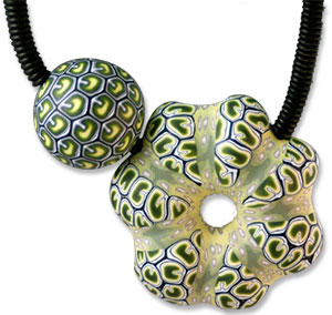Niche Award winner Melanie West enjoys the challenge of a new design and she’s engineered some clever solutions with her new polymer Ball and Star necklace shown here. A magnet secures the ball next to the star and acts as a clasp on this piece which is strung on buna cord (and check out what looks like buna rings over the cording).