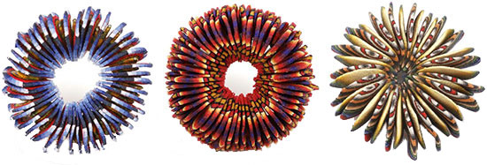 These 2 3/4″ wide polymer and silver urchin brooches from Ford/Forlano are part of their offerings at the Philadelphia Museum of Art Craft Show. This quick video offers a sneak peek at their new booth and latest works. Kathleen Dustin is also in this prestigious show.