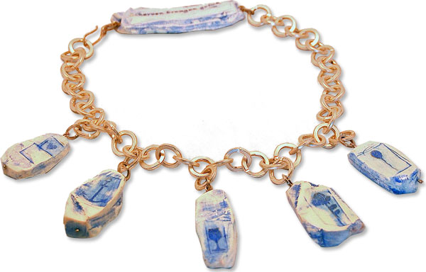 What look like pieces of broken Delft pottery in this Scherven Brengen Geluk are modern polymer good luck charms from the Netherland’s Linda Ezerman.