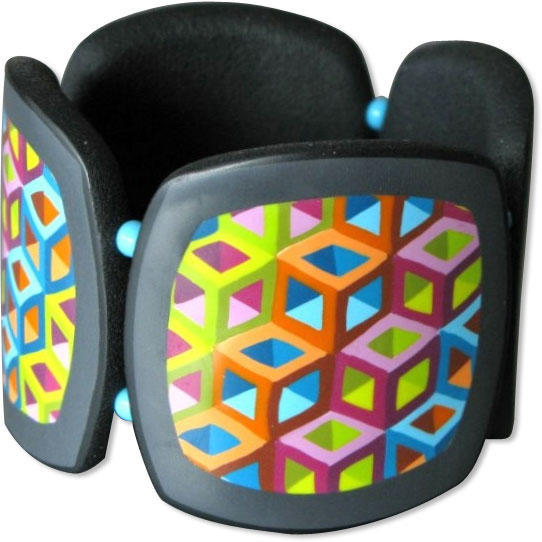 There’s a buzz around the neat colorful tumbling blocks canes by Germany’s ST-Art-Clay. This updated interpretation of the historic quilt pattern uses shades of the colors to give the design dimension created by extruded triangles and edging strips.