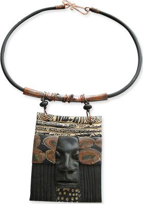 You’d be hard pressed to identify the polymer techniques that Washington’s Pam Sanders uses in her Paul’s Gift neckpiece. There’s some caning, some carving, some sculpting but the real strength is in Pam’s composition and in its strong, dark rawness.