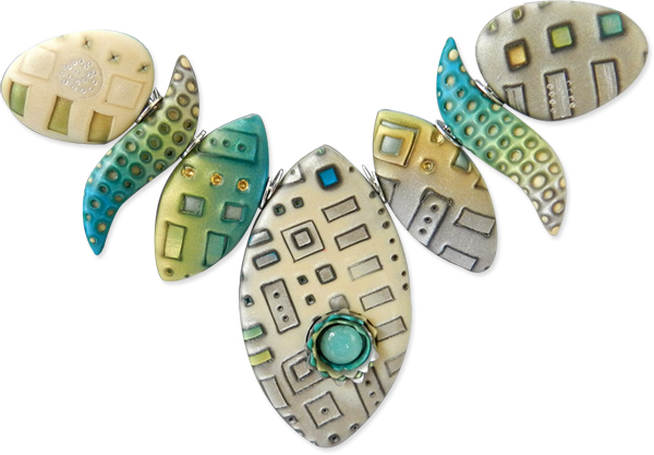 She’s been including tinted epoxy resin in her recent pieces at the suggestion of fellow hardware lover Robert Dancik. The two shared a table as they worked on collaborative projects for the Polymer Clay Master Class book and the creative sparks flew.