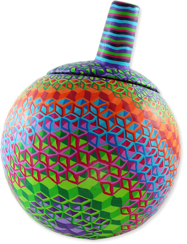 Wanda Shum covered a “Who’s da bomb?” form with tumbling block cane slices. She shows the hexagon canes she started with and her color palette on her blog. It takes some staring at the basic triangle and diamond shapes to get the gist of it.