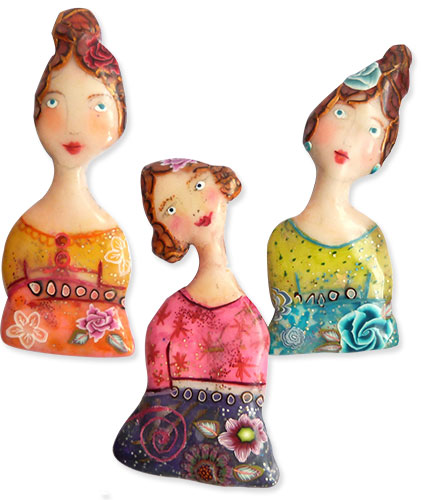 Lucille, Hortense and Annie greet you with flirty smiles. Chifonie’s Les Trois Filles are 4″ long-necked brooches made using a combination of canes and delicate drawing. Their softly rouged cheeks, tilted heads and floral clothing give them a winsome appeal that’s very different from most faces in polymer.