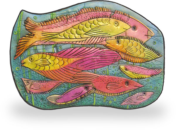 She says of her 5″x7″ polymer plaque, “It started off as scrap clay, mostly pink and white on a muddy gray. I decided it looked like a bunch of wiggly fish but I didn’t like the gray so I cut the pink and white shapes out. I scratched some lines into the base for waves and added a few strings of seaweed.The fish were laid on top and burnished down lightly. I used a pointy tool to make the lines and then I covered the entire thing with black and metallic blue Perfect Pearls powder.”