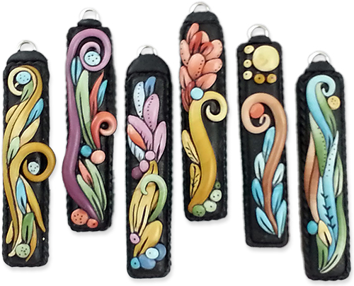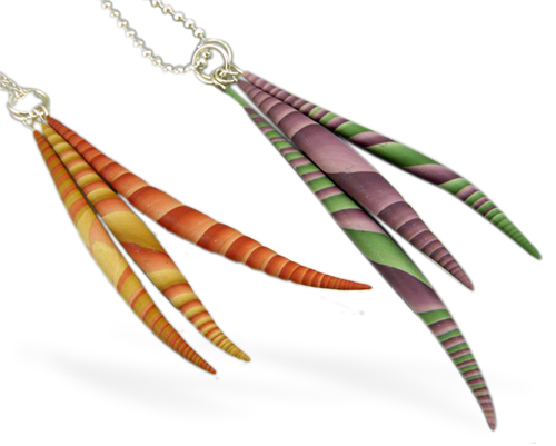 She’s also adept at rolling snakes from bits of Skinner blend and then forming them into sinewy floral earrings and pendants. Barb hunts for bargains on bamboo placemats that she disassembles.