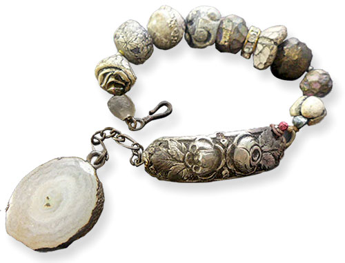 These circles are from a blend (teal/fuschia/zinc) that I rolled endlessly today. The jaunty disks were inspired by a friend’s thrift store find. Her necklace was made of wooden disks. “Wouldn’t that look great in polymer?” I thought.