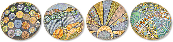 Carol Simmons has figured out how to bring control to the chaos of polymer clay kaleidoscope canes. These samples were all generated from one base cane.
