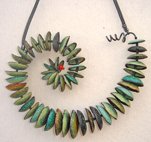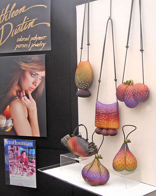 […] Kathleen Dustin:  Kathleen has once again pushed the envelope in creating and developing techniques in polymer clay.  With a background in math and then ceramics, Kathleen first became known for her astonishing millefiore cane work.  Then she perfected the depth of surface technique with translucent polymer clay which allowed her to create exquisite museum quality handbags most notable for their depiction of the female face and form.  Now Kathleen has pushed the envelope again with pod forms.  I joked with Kathleen that it looked like she had been playing in her garden.  “No,” she said “I’ve been walking alot in the woods picking up pods.”  I want to take a walk in those woods.  Kathleen’s web site will be updated in the near future with these new pieces.  They are simply stunning! (Note: a shot of Kathleen’s new work is currently posted on Polymer Clay Daily.) […]