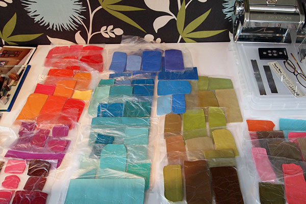 With a box of companion bullseye canes and another box of mica shift textures, she’s assembled the raw materials for a fresh line of brooches, pendants and earrings.