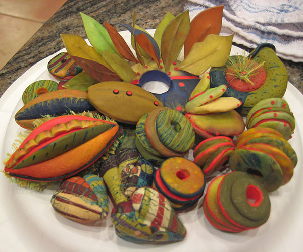 These polymer color chips scattered around Seth Savarick’s work area look like beach glass or Italian ice. They’re what Seth calls his “gossamer gills” and to create shapes he stacks paper-thin multicolor layers of the baked translucent clay.