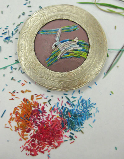 Here’s the in-progress shot in case you missed it. Baked, splinter-sized pieces of rolled polymer are set into unbaked clay, a tedious but meditative process.