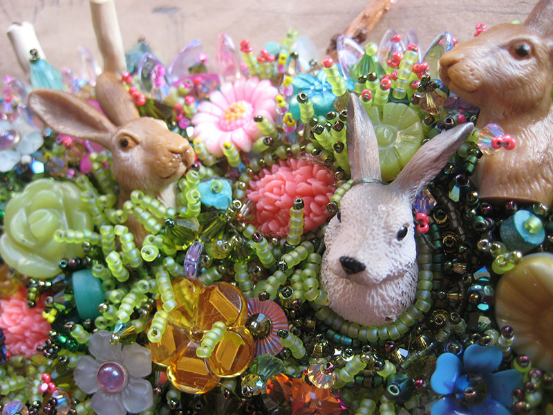 There are a few polymer mushrooms and such in this beaded bracelet by Wendy Malinow. The rabbits are beheaded toys surrounded by seed beads and crystals. It’s a sumptuous seasonal piece that’s irresistable. Here’s a close-up. Wendy grew up in this area of Oregon where such moss and wildlife and dewy sparkling flowers are plentiful in spring.
