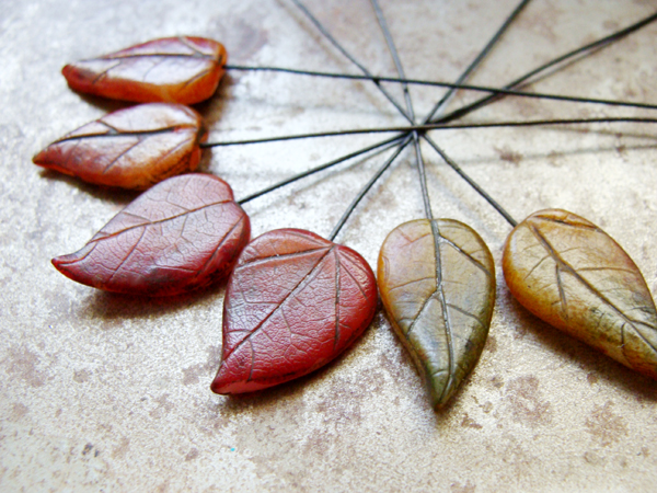 Heather Powers shows us how handy the falling leaves can be. “I used translucent clay and stained the polymer with color so they glow in warm fall hues when held up to the light,” she says of her newest collection.