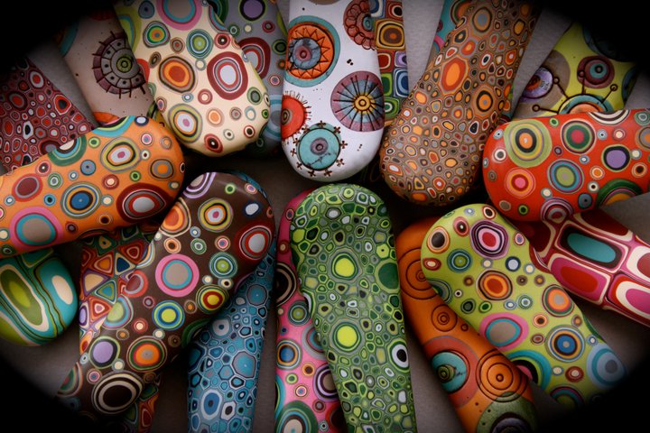 Michigan’s Sandra DeYoung-Niese wires her molded, painted and inked polymer beads onto a thin brass bangle – a fresh treatment that syncs perfectly with her vibe which is part beach, part trendy bohemian.
