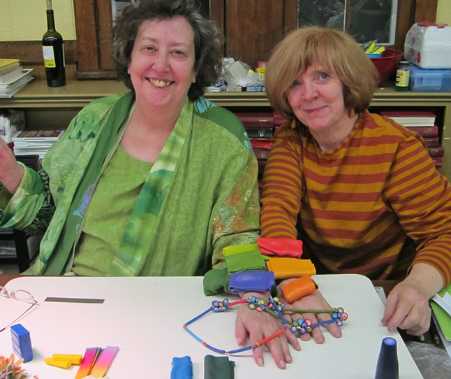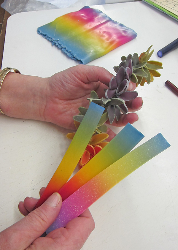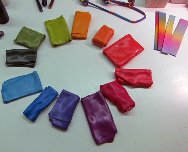 Even as I watch her work, her way of creating seamless gradations baffles me. She checks and rechecks her colors before putting them into the long multi-color canes that she needs for production (see her test strips). It’s hard to keep my eyes on my own work surface when these colors are exploding at the next table.