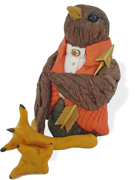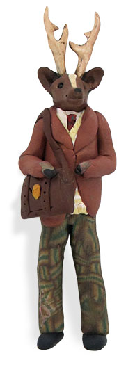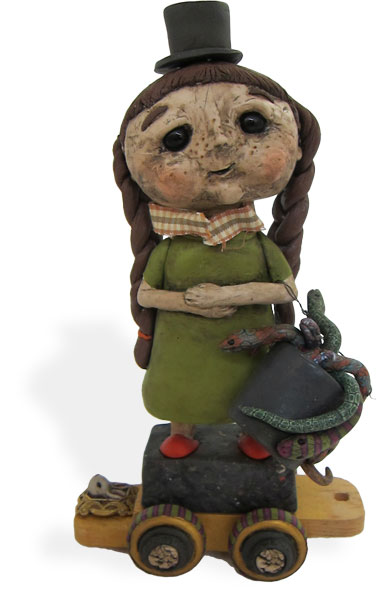 Leslie grew up in the woods of Kentucky and Tennessee and she has an affinity for snakes and birds and other woodsy creatures. She dresses her versions in costumes and puts them in baffling situations that charm and delight. Here’s a reclining bird, a deer in camoflage, a girl with a bucket of snakes, and a wine glass that might give you pause.