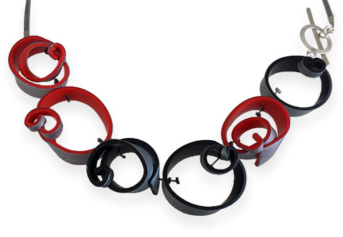 While he has folded and sculpted polymer in his art, this ribbon-like necklace and another spiraled link necklace point to a departure and new experiments.