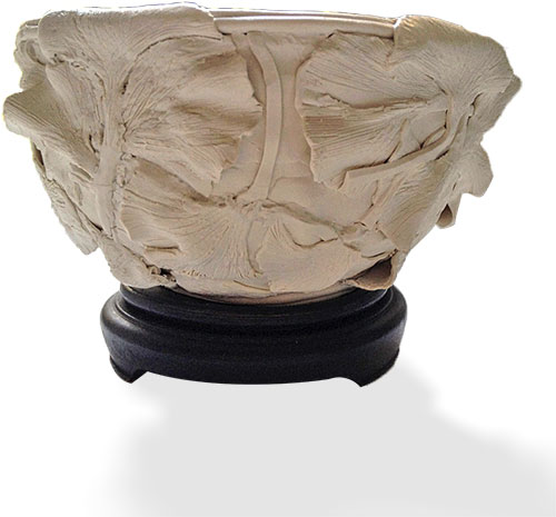 Her Feathers and Pinecones Bowl (below) is encrusted with leaves and branches. Here’s the side view of the bowl. Veronica’s polymer jewelry is covered with dense foliage as well.