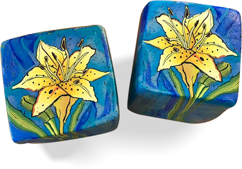 The painterly backgrounds on these flower canes from Maine’s Jayne Dwyer accentuate the realistic flower images.