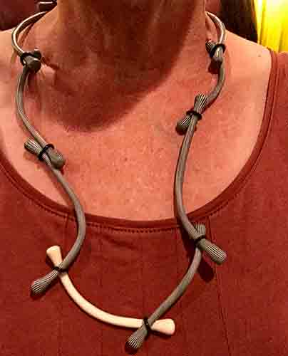 A more recent version of Melanie’s necklace shown at left includes curled sections, a play on vine-like necklaces by Maggie Maggio. In true Synergy spirit, Georg Dinkel joined in and suggested adding contrasting dots on the end of each link! And she’s not finished experimenting.