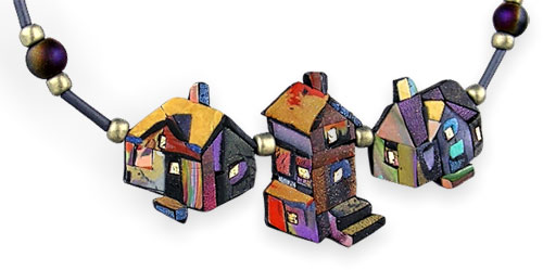 New Mexico’s Gael Keyes makes fantastical bugs and beetles with fancy wire legs dressed in polymer and beaded antennae. They’re composed of scrap clay twisted into a Natasha bead pattern to create the bookend pattern on their backs and wings.
