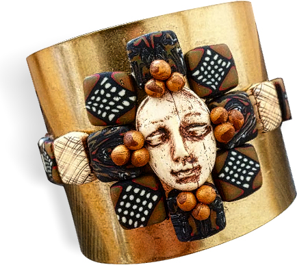 What look like ancient relic beads were cooked up by Marina Rios (fancifuldevices) using a combination of pan pastels and paste wax on polymer. Looks like some heat was applied too. Rough and ancient yet colorful.