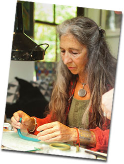 Conny is fond of irregular and surprising shapes. She challenges herself with what seem impossible constructions like her entry in this year’s IPCA awards. Skinner-blended extruded strands wove through a central structure to create a complex geometric pendant.