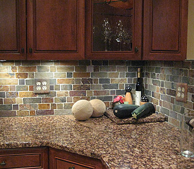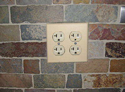 | An expensive kitchen renovation with slate backsplash fell flat because the customer's generic switchplates were what caught your eye first as you entered the room. Bummer. | I brought some leftover scraps of backsplash home so that I could match the colors. I textured the faux stone with real texture plates (from Victoria James) and wiped acrylic paint into the crevices. |