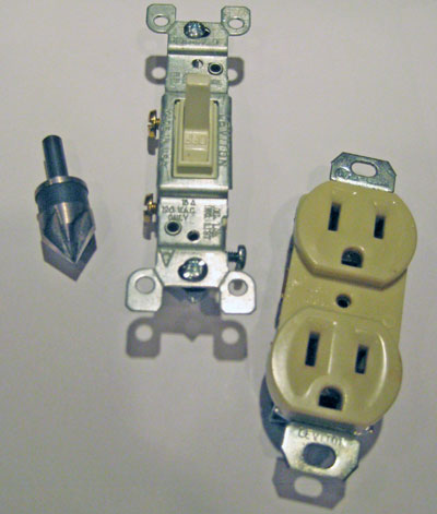 My husband fished out some sample electrical switches from his workshop so that I could trim the holes to fit perfectly. I used his countersink bit by hand to rout out the holes at an angle so that the screws set flush. I liked the look so much, I made some for my own kitchen. I've added a couple of "after" pictures below. |